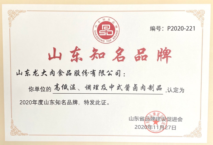 龍大肉食兩大品牌(產品)入選2020年度山東知名品牌認定名單