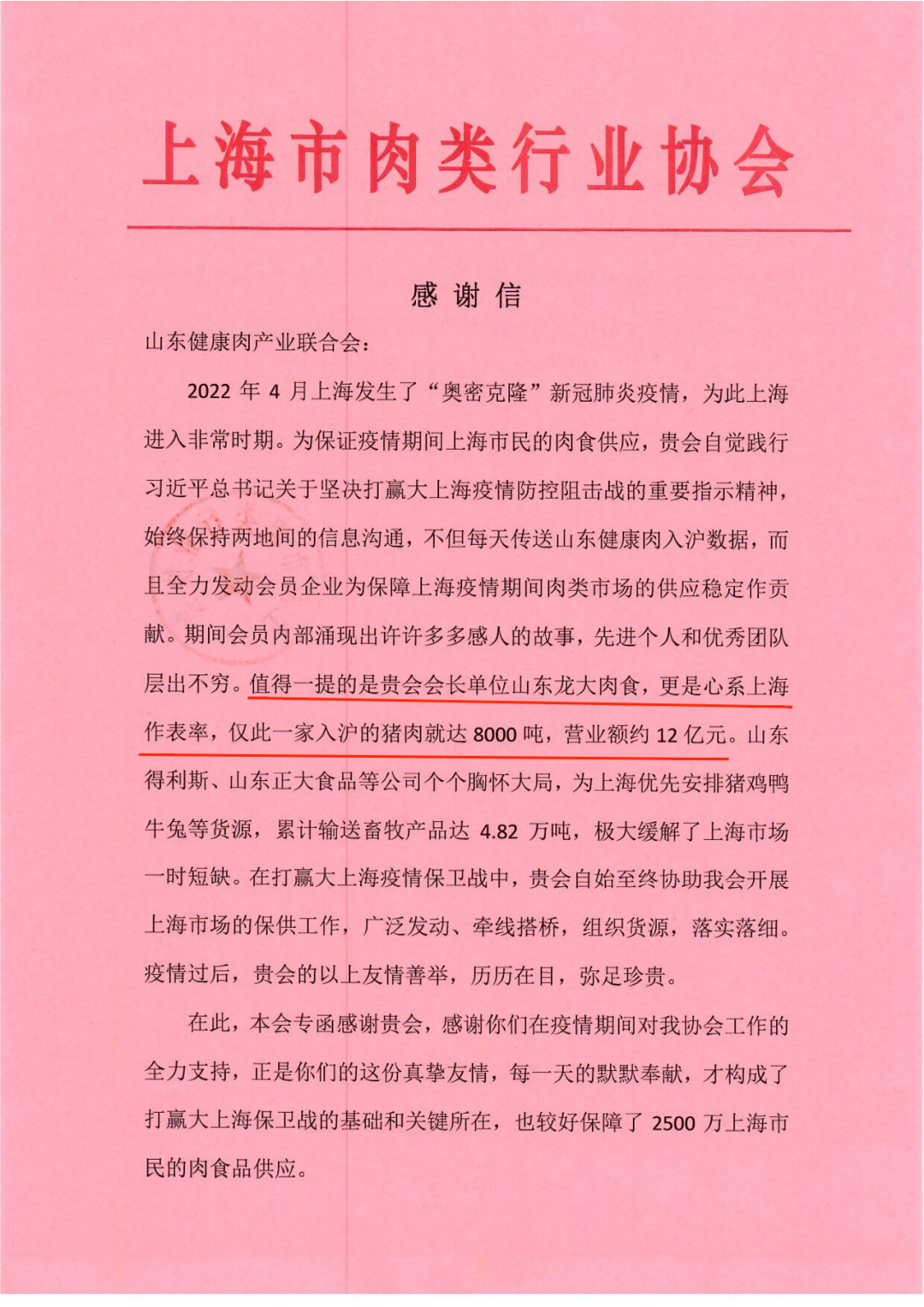 7月20日,上海市肉類行業(yè)協(xié)會(huì)向山東健康肉產(chǎn)業(yè)聯(lián)合會(huì)發(fā)來感謝信,感謝山東健康肉產(chǎn)業(yè)聯(lián)合會(huì)在疫情期間為保證上海市民的肉食供應(yīng)所做出的努力與貢獻(xiàn)。感謝信中特別提到,龍大美食作為山東健康肉產(chǎn)業(yè)聯(lián)合會(huì)會(huì)長(zhǎng)單位,心系上海做表率,疫情期間入滬肉食達(dá)8000噸,為上海市抗疫保供做出了重要貢獻(xiàn)。